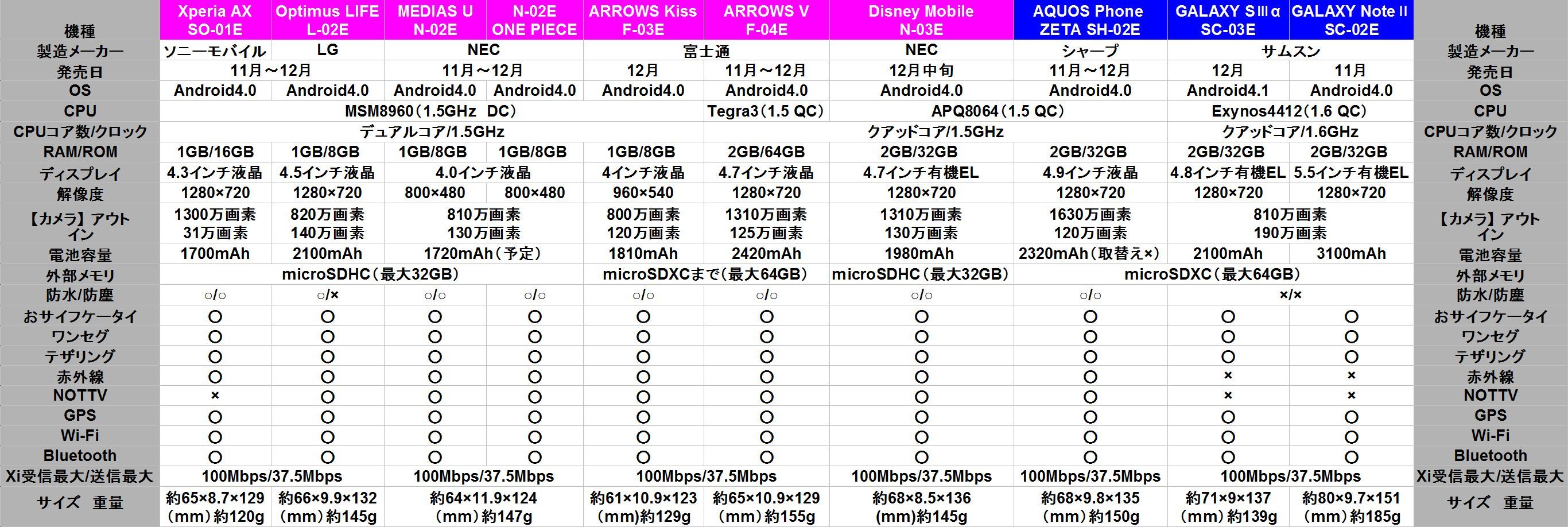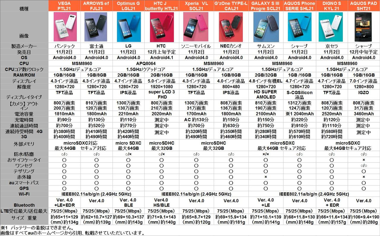 au2012年冬モデルの発表!全機種au 4G LTE搭載 機種比較表あり。さらに春モデルの情報も!