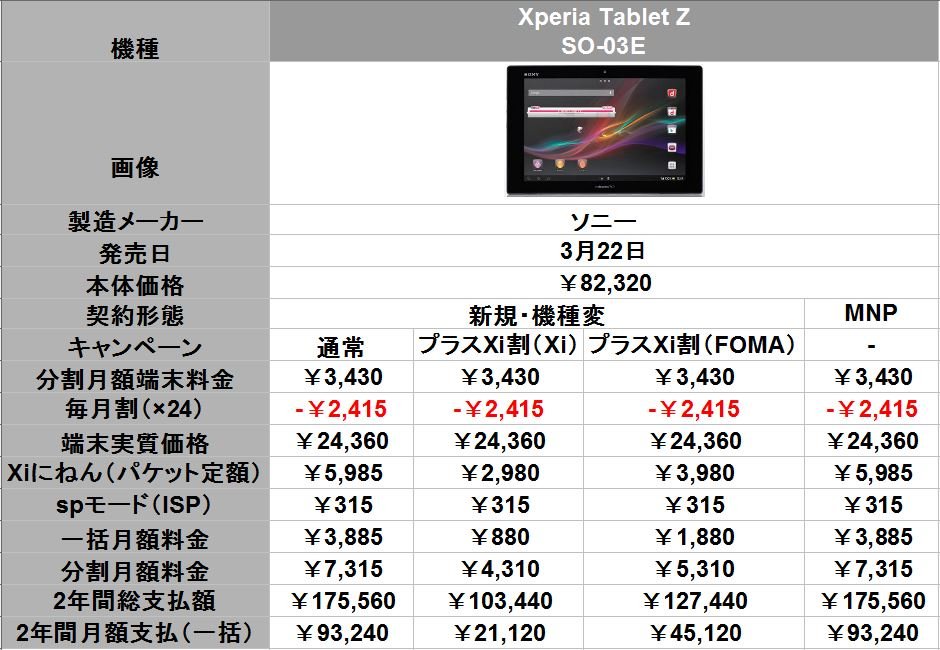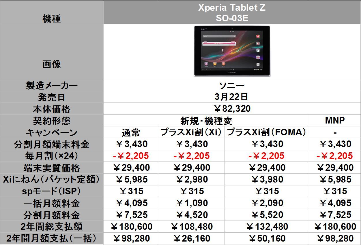今日はXperia Tablet Z SO-03Eの料金表を作ってみました!