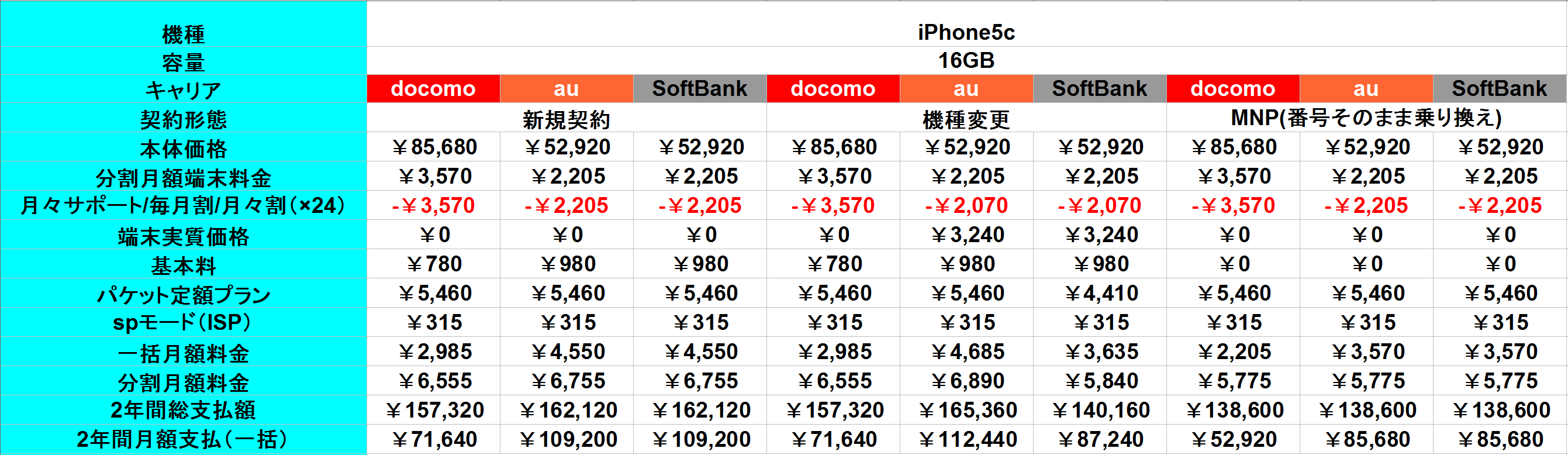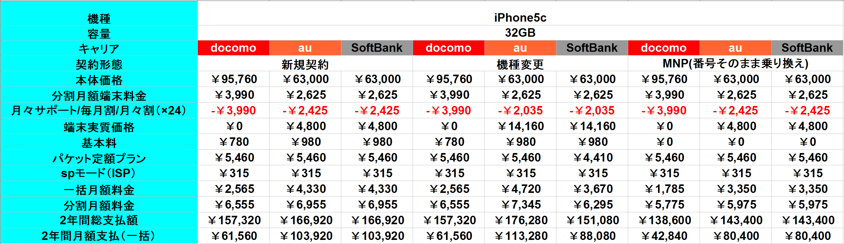 iPhone5cの端末価格、割引額、実質価格がわかりました。料金表を作ってみた。