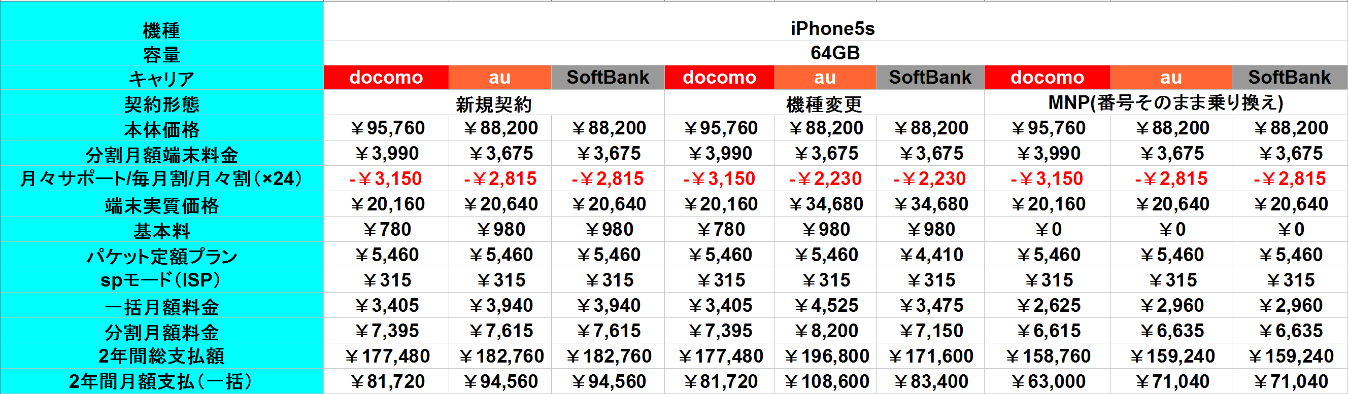 iPhone5sの端末価格、割引額、実質価格がわかりました。料金表を作ってみた。