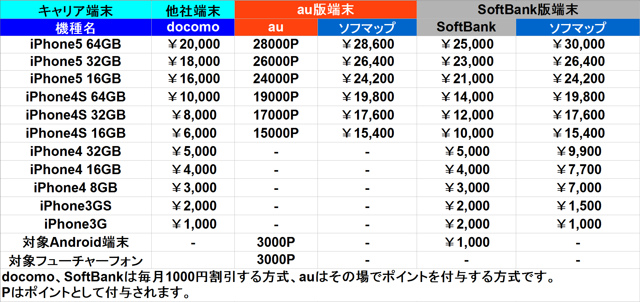 SoftBankが9/20~ 10/31までの下取り値引き表を発表しました。