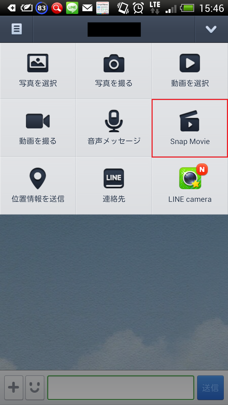 1)友だちのトークで+ボタンを押して、SnapMovieを選択する。