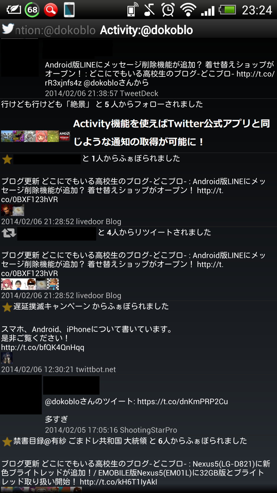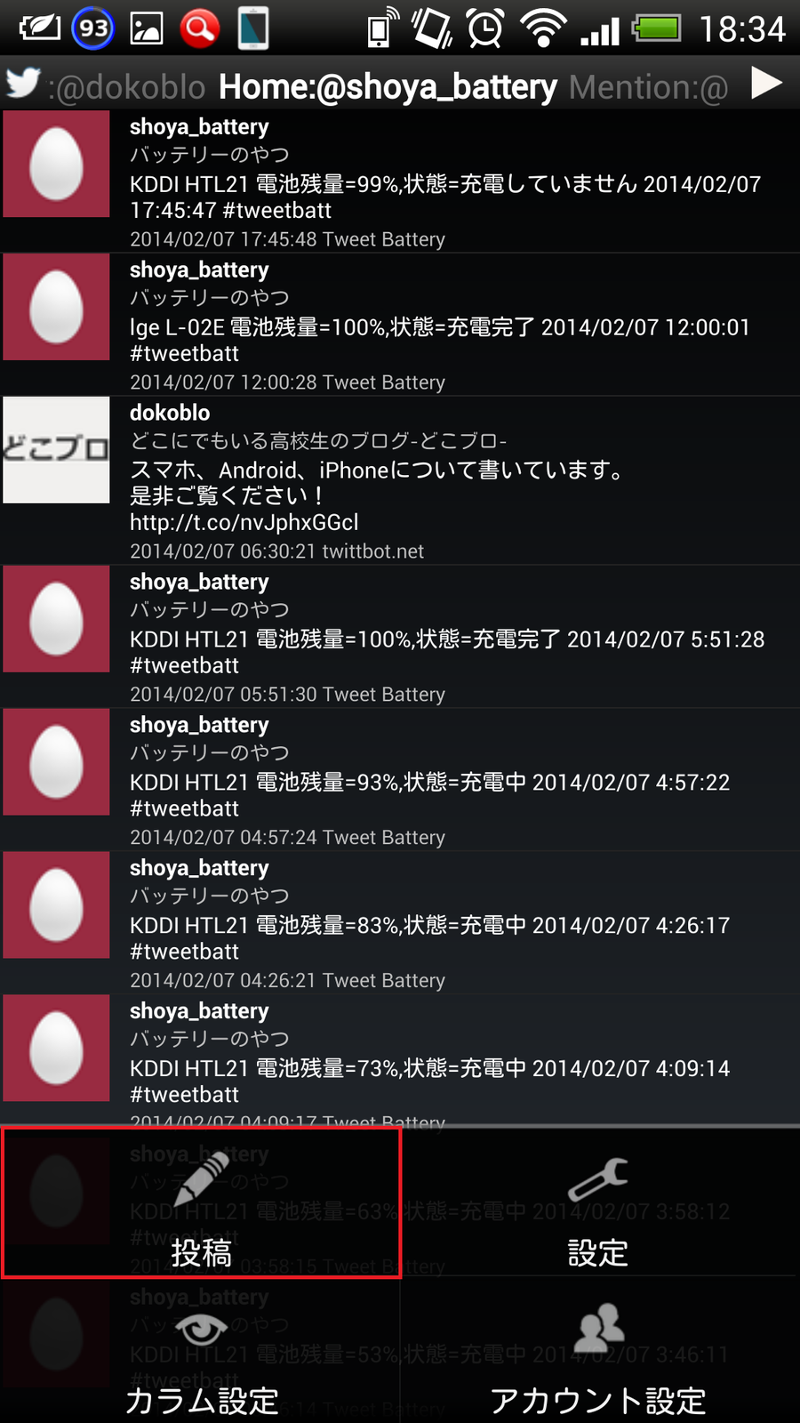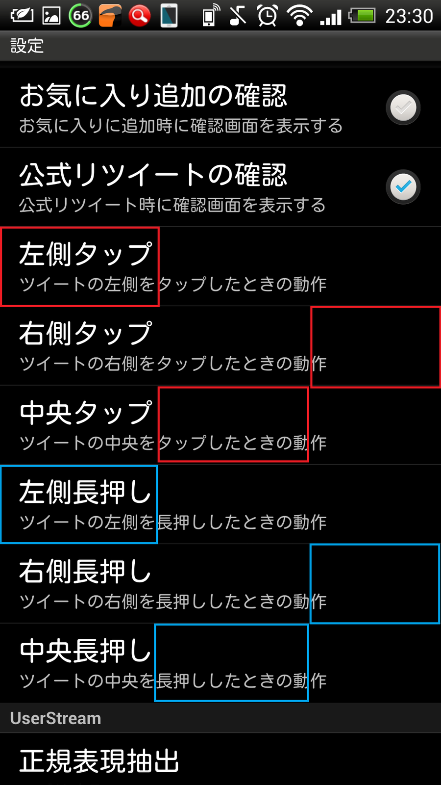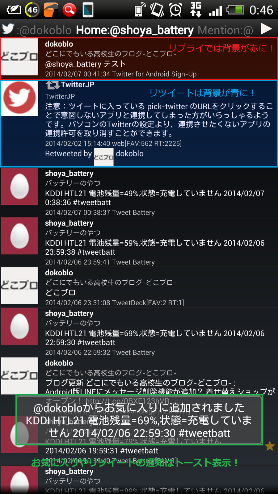 UserStreamボタンは少々押しづらいですので、頑張ってくださいw - お気に入り、リツイート、フォロー等の通知はトースト表示とステータスバー表示