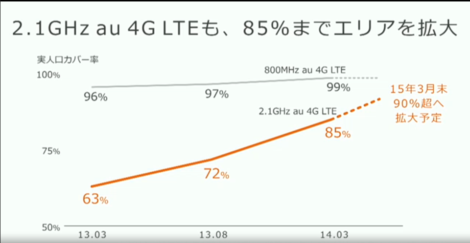 auは2.1GHz帯のLTEの実人口カバー率が85%に達成したと昨日発表がありました。