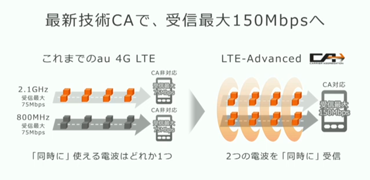 今までは同時に利用できる電波は2.1GHz帯と800MHz帯どちらか一つでしたが、CAが始まれば2つ同時に利用して速度も2倍というふうになります。