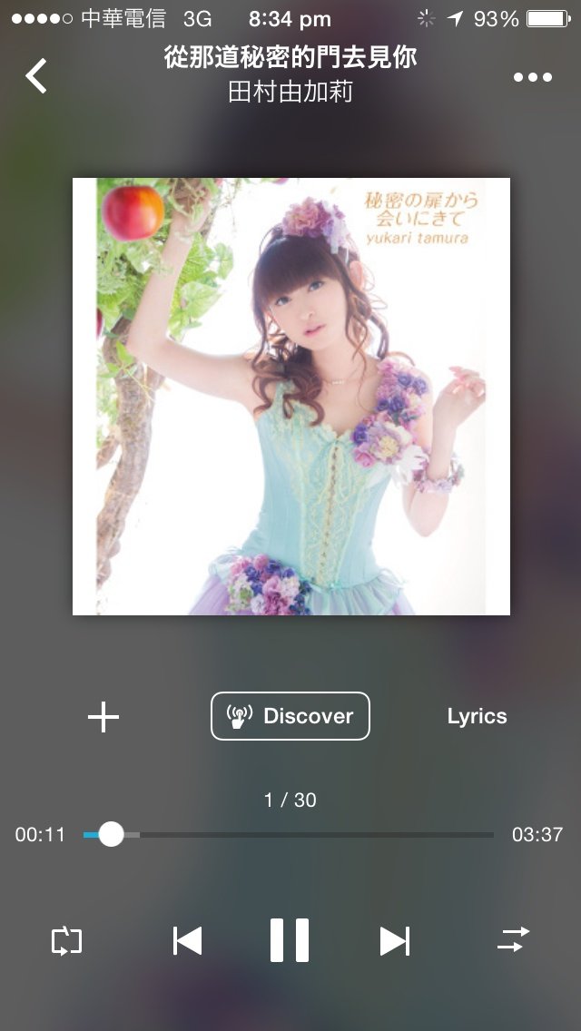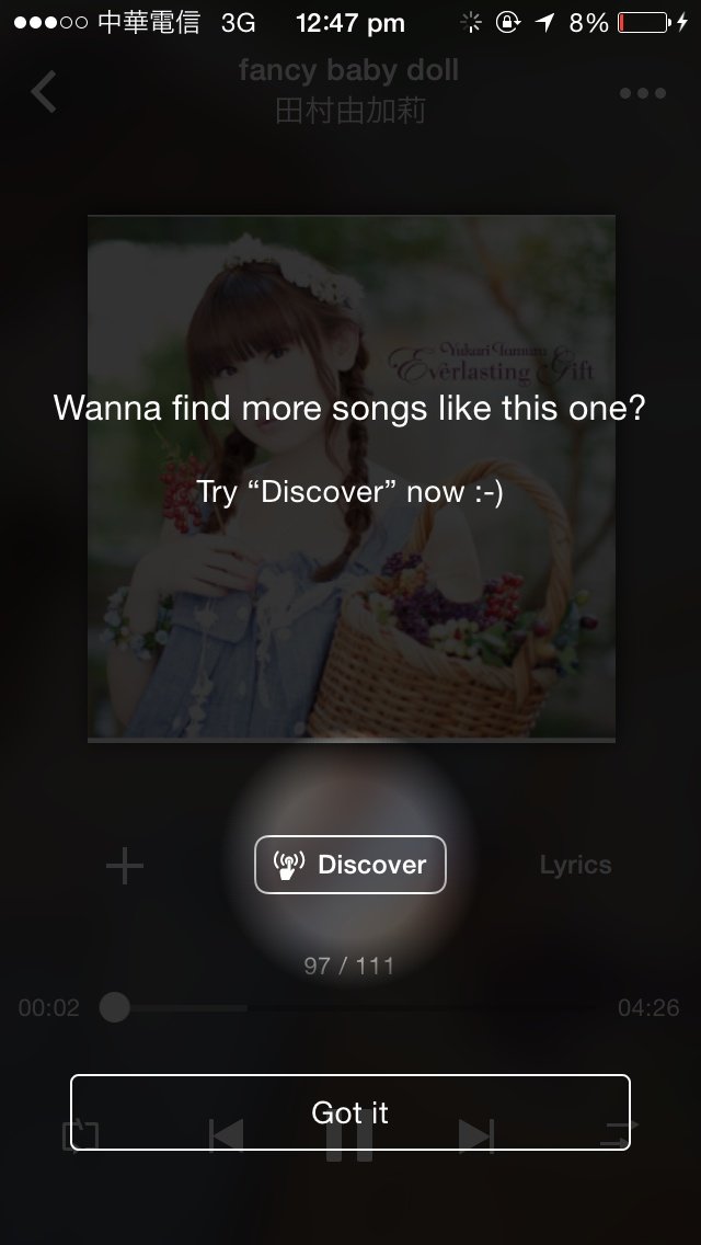 新しい再生UIではアルバムの画像が中央に小さくなり、その分下に今回から追加された”Discover”のボタンが。個人的にはシャッフルとリピートがワンタップで変えられるようになったのがかなりツボ。