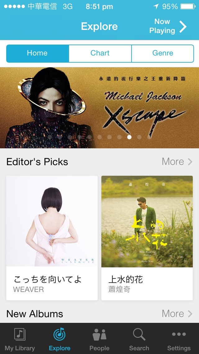 音楽再生画面以外にもUIが結構変わっているところがあり、例えば”Explore”。Homeタブの一番上にはバナー、その下に編集室オススメなどの配置がかなり変わり更に押しやすいようにか、アルバムの写真一つ一つがかなり大きくなりました。チャートも独立タブとして一新され、今世の中で何が流行っているのかわかりやすくなりました。