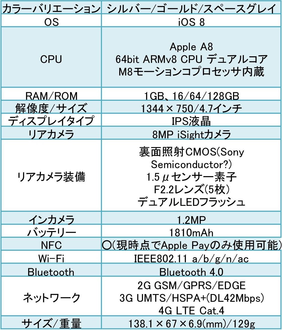 主な進化点としては、液晶が先代5sの4インチから4.7インチへ大型化、11ac対応によるWi-Fiの高速化、LTE Cat.4対応により下り最大150Mbps対応、新たにNFCのサポートなどがあります。